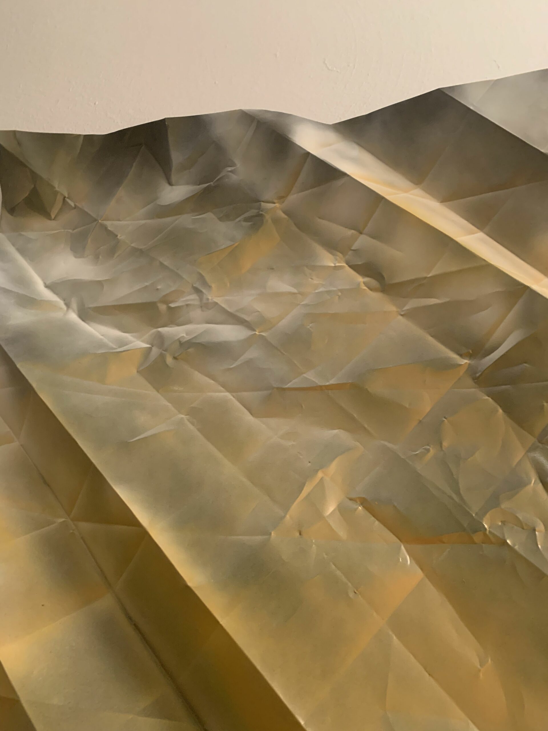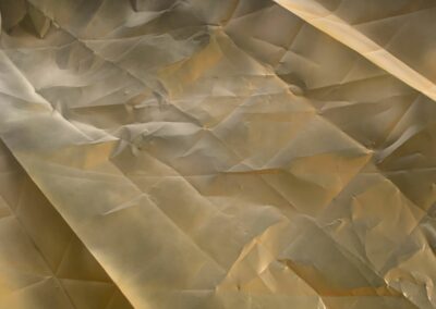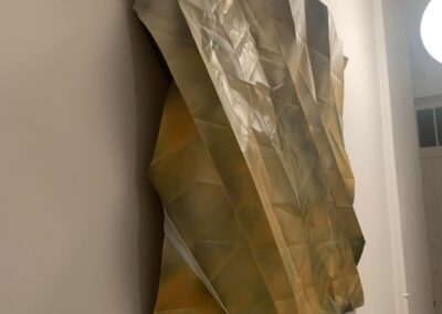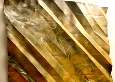 This work expresses an objective reality, holding within it the fluidly crumpled and intentionally folded paper that transmutes volume and light. This simple technique produces a sense of the infinite moments of beauty in folded light.