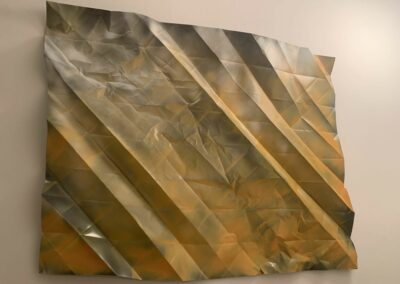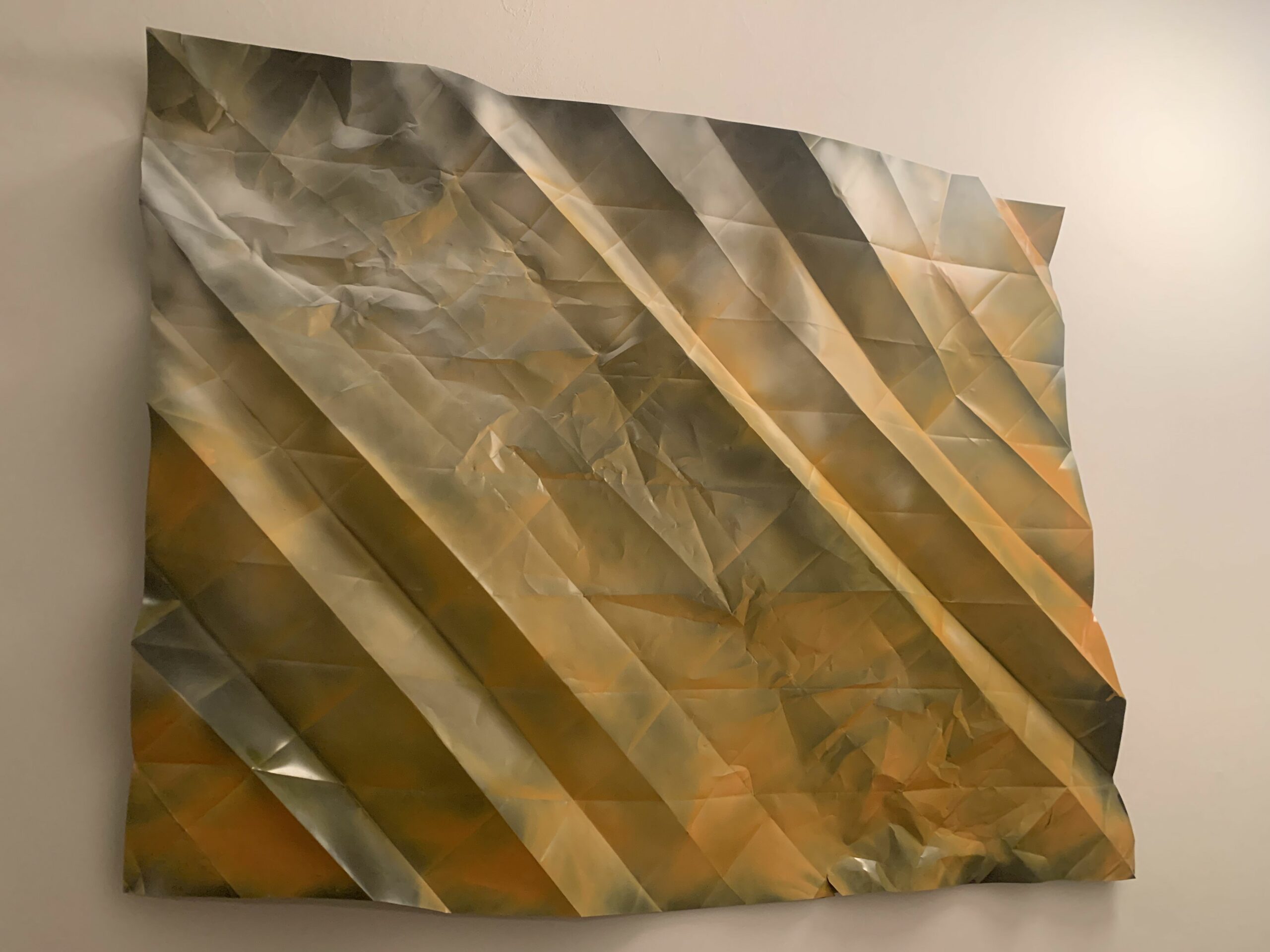 The work has only two variables, paper and spray. The paper is wrinkled, and folded into origami. It is painted in this state to highlight all the manipulation of the paper and its unique character speaking to direct the paint into a photograph of abstract topology.
