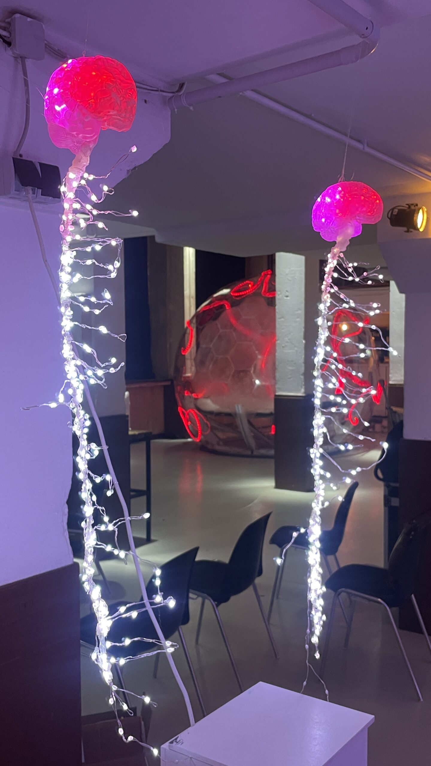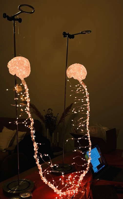 The piece takes you through four events of a human brain processing pain, empathy, dreaming with memory recall, and death. The sculpture mimics the activity of the spinal cord and brain during the physical pain of touching something hot with both hands and juxtaposes it to the observed similar brain activity during empathy recall. The second pair of contrasted events follow the brain and spinal cord activity of a body in the process of dying, during and after breathing and heart beating stop, and in juxtaposition the brain activity during dreaming with a side of memory recall. I invite the viewer to see these thoughts played outside their bodies on a transparent brain, and, through the view of this model, also to question their philosophical constructs of death, dreaming/memory recall, pain, and empathy.